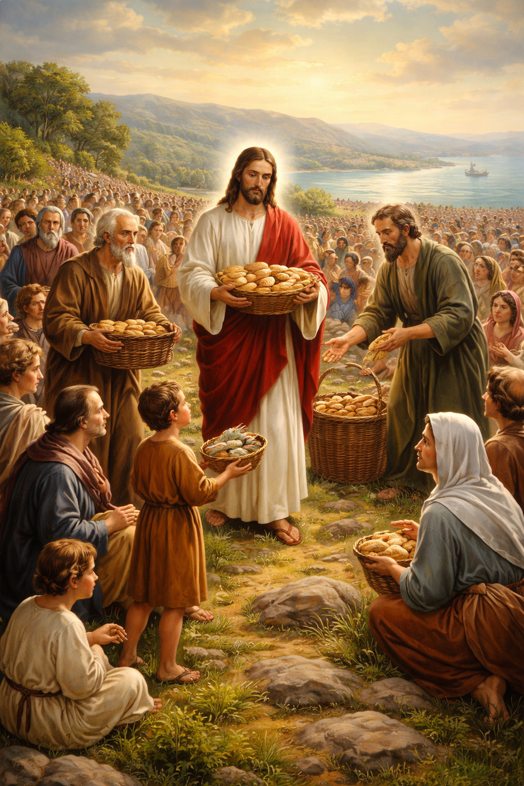 Komentaras Šioje ištraukoje matome ne tik stebuklą, bet ir Jėzaus žvilgsnį į žmogų. Jis pirmiausia pastebi poreikį – alkį. Tai svarbi detalė: Dievas nėra abejingas kasdieniams mūsų rūpesčiams. Jėzus klausia Pilypo ne todėl, kad nežinotų atsakymo, bet kad išbandytų mokinių tikėjimą. Jie mąsto „žmogiškai“ – skaičiuoja, vertina trūkumą. Andriejus pastebi berniuką su menku maistu, bet pats abejoja: „Ką tai reiškia tokiai daugybei?“ Tai mūsų logika: per mažai, nepakaks. Tačiau Jėzaus veikimas prasideda nuo to, kas Jis yra. Jis paima tuos penkis kepaliukus ir dvi žuvis, dėkoja ir dalija. Stebuklas vyksta dalijimo procese. Tai svarbi dvasinė tiesa: kai atiduodame tai, ką turime, Dievas padaugina. Dar viena stipri žinia – „kad niekas nepražūtų“. Dievui svarbus kiekvienas trupinėlis, kiekvienas žmogus. Ir galiausiai – Jėzus atsitraukia nuo minios, kuri nori jį padaryti karaliumi. Jis neatėjo būti žemiškos galios valdovu, bet parodyti kitokią karalystę – meilės, dovanos ir pasitikėjimo. Trumpa maldelė Viešpatie Jėzau, tu matai mano trūkumus ir baimes. Išmokyk mane nebijoti, kad turiu mažai, bet pasitikėti, kad tavo rankose viskas gali tapti gausa. Padėk man dalintis – savo laiku, gerumu, dėmesiu, ir tikėti, kad tu padauginsi tai, ką tau atiduodu. Amen.
